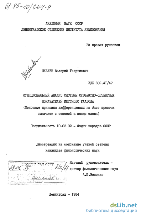 2. Данное исследование выполнено в Секторе палеоазиатских и самодийских языков Ленинградского отделения Института языкознания АН СССР. Работа состоит из введения, трех глав, заключения, списков цитированной литературы и сокращений, а также двух приложений: моделей финитных форм глаголов с основой в конце слова (ОКС), сопровождаемых некоторыми типичными примерами, и списка простых глаголов с ОКС. В первой главе дается общая характеристика ООП, излагаются два основных принципа дифференциации этих показателей, условно названных нами оппозициями "активность-инак-тивность" и "статичность-динамичность ближайших актантов предиката", то есть субъекта и прямого объекта. Во второй и третьей главах подробно описывается в рамках указанных оппозиций субъектно-объектное спряжение простых глаголов с ОКС. Исследование выполнено, в основном, описательным методом на синхронном уровне с неко-