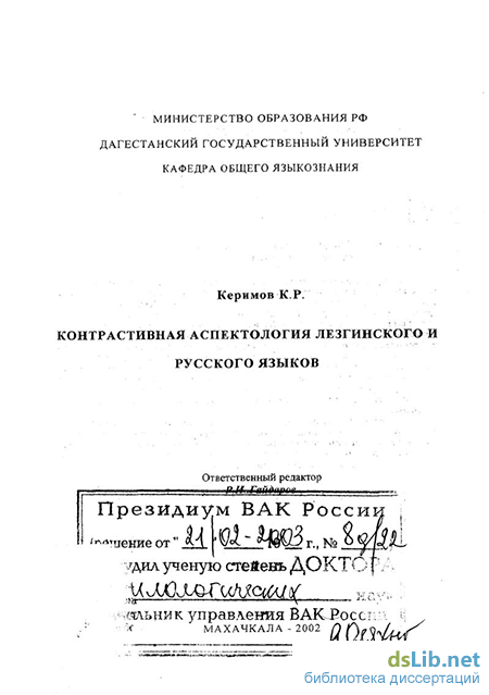 Керимов Керим Рамазанович. Контрастивная аспектология лезгинского и русского языков : диссертация ... доктора филологических наук : 10.02.02, 10.02.20.- Махачкала, 2002.- 266 с.: ил. РГБ ОД, 71 03-10/116-X
