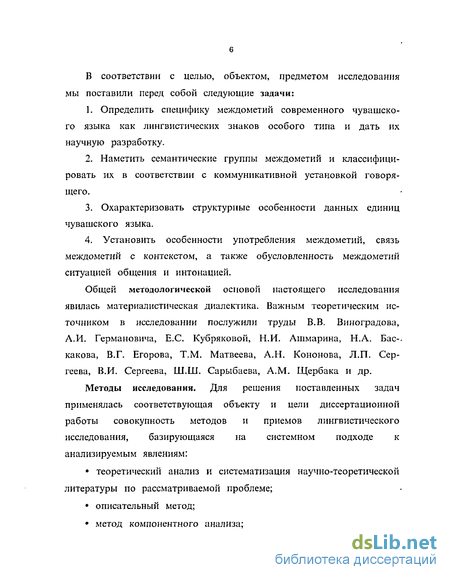 С учетом цели исследования в качестве его предмета в изучаемом объекте определены междометия чувашского языка, представляющие собой важный компонент живой разговорной речи, но тем не менее не подвергавшиеся до сих пор монографическому исследованию.