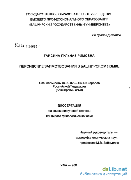 Диссертация состоит из введения, четырех глав, заключения, библиографии, приложения (словарь башкирско-персидских лексических параллелей, списка принятых сокращений и условных обозначений).