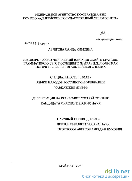 Апробация работы. Основные положения и результаты исследования обсуждались на заседаниях кафедры адыгейской филологии Адыгейского государственного университета. Кроме того, результаты анализа словаря Л.Я. Люлье были представлены на международных, всероссийских, региональных и межвузовских научных конференциях. По теме диссертации опубликовано 10 печатных работ, в том числе в изданиях, рекомендованных ВАК РФ.