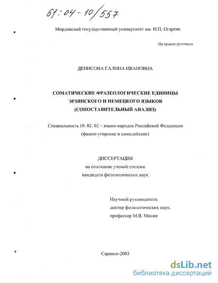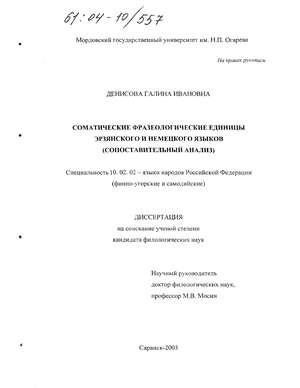 В первой главе проводится сопоставительный анализ соматических ФЕ в структурно-сопоставительном аспекте, направленный на выявление их структурно-грамматического параллелизма и структурно-грамматических расхождений в эрзянском и немецком языках; выявляются основные продуктивные модели, по которым образованы соматические ФЕ.