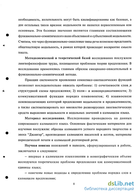 Принцип системности проявления семантико-синтаксических функций позволяет последовательно описать проблемы: 1) сочетаемости слов,и структурной схемы предложения; 2) поли— и монопредикативности; 3) коммуникативной функции порядка компонентов; 4) взаимосвязи основополагающих категорий предложения модальности и предикативности, а также систематизировать все множество разнояруспых лингвистических средств выражения модальности и модальных значений в калмыцком языке.