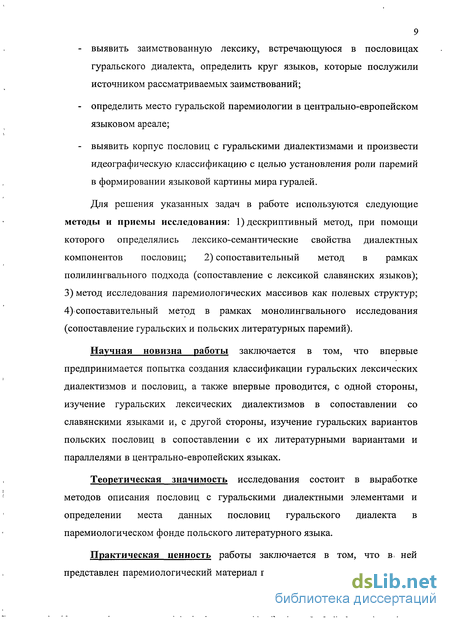 Методы исследования. Методы, использованные в диссертации, определяются целями и задачами исследования. При исследовании были использованы: 1) дескриптивный метод, при помощи которого определялись лексико-семантические свойства диалектных компонентов пословиц; 2) сопоставительный метод в рамках полилингвального подхода (сопоставление с лексикой славянских языков); 3) метод исследования паремиологических массивов как полевых структур; 4) сопоставительный метод в рамках полилингвального исследования (сопоставление гуральских, польских литературных паремий и паремий языков центрально-европейского ареала).