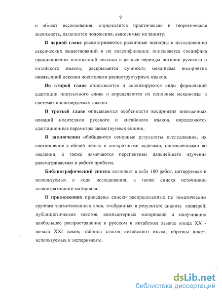 В первой главе рассматриваются различные подходы к исследованию лексических заимствований и их классификации; описывается специфика проникновения иноязычной лексики в разные периоды истории русского и китайского языков; раскрывается сущность механизма восприятия иноязычной лексики носителями разноструктурных языков.
