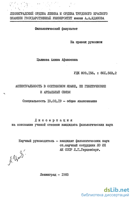 Аспектуальность в осетинском языке, ее генетические и ареальные связи" предполагает сопоставительное исследование аспектуальных отношений в осетинском и русском, а также в некоторых других индоевропейских и иберийско-кавказских языках с выявлением черт сходства и различия в плане содержания и структурной организации функционально-семантического поля аспектуальности, являющегося "единством универсальным" / А.В.Бондарко, 1983, с.77/. Оно представлено во всех языках, так или иначе взаимодействующими языковыми средствами , выражающими характер протекания действия во времени. Не выяснив определенного круга вопросов, связанных с понятием "аспектуальные отношения" в каждом из исследуемых языков, невозможно установить генетические и ареальные связи тех основных языковых средств, которые образуют функционально-семантическое поле аспектуальности в осетинском.