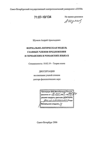 ткани, но и по-новому объяснить такие особенности исследуемых конструкций, которые наблюдались, но не получили удовлетворительного объяснения в рамках традиционной грамматики; 4. Конечной точкой настоящего анализа явилось создание качественного иного подхода к изучению взаимоотношений сказуемого и подлежащего, который, в сравнении с традиционными подходами, обладает большей объяснительной силой. Теоретическая и практическая ценность полученных результатов состоит в том, что они дают надежный инструмент не только для описания, но и для объяснения всего разнообразия конструкций сказуемого и подлежащего (в том числе допускающих в свой состав лексически десемантизированные части речи) в германских и романских языках, восполняя тем самым существенный -учитывая конституирующую роль сказуемого и подлежащего в производстве предложения - пробел в современной теории языка. Таким образом, основные выводы и положения работы могут быть использованы в курсах теории языка, грамматики германских и романских языков в ВУЗах, в спецкурсах по структурной типологии и категории глагольного времени, а также на практических занятиях по немецкому, английскому и французскому языкам при обучении более глубокому пониманию иностранной речи и текста, говорению на иностранном языке и переводу с иностранного языка и на иностранный язык. В этом последнем аспекте результаты исследования используются кафедрой иностранных языков гуманитарного факультета Санкт-Петербургского государственного электротехнического университета при обучении студентов, изучающих шведский язык как третий иностранный (параллельно с английским и немецким). Практическая ценность результатов исследования и проводимого в нем формально-логического подхода подтверждается также и тем, что в настоящее время с их использованием кафедрой иностранных языков гуманитарного факультета С.-Петербургского ГЭТУ ведется разработка лекционных курсов «Теоретическая грамматика» и «Методы формализации естественных языков».