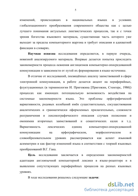 Научная новизна исследования определяется, в первую очередь, новизной анализируемого материала. Впервые делается попытка проследить закономерности процесса освоения англицизмов компьютерно-опосредованной коммуникации в зависимости от путей их формирования в языке-источнике. В отличие от исследований, посвящённых анализу заимствований в сфере электронной коммуникации, в диссертационной работе делается акцент на периферийных, флуктуационных (термин И. Пригожина) процессах как имеющих потенциальную возможность воздействия на системные закономерности языка. Это проблемы орфографической вариативности, родовых колебаний существительных, сосуществования аналитических и грамматически оформленных прилагательных, сложности разграничения и лексикографического описания случаев полисемии и омонимии вторичных заимствований и семантических калек и т.д. Вариативность лексических единиц компьютерно-опосредованной коммуникации на орфографическом, морфологическом и словообразовательном уровнях рассматривается как аспект языковой асимметрии и как фактор изменений языка в соответствии с теорией языковых преобразований В.Г. Гака.