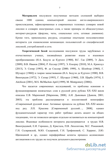 Теоретической базой исследования стали труды зарубежных и отечественных ученых, посвященных развитию языка и языковым преобразованиям (И.А. Бодуэн де Куртенэ, В.Г. Гак, Э. Даль, В.В. Иванов, Р. Келлер, Э. Косериу, М.А. Кронгауз, Э. Сепир, Ф. де Соссюр, А. Шлейхер, Г. Шухардт), теории заимствования (И.А. Бодуэн де Куртенэ, В.В. Виноградов, Э. Сепир, Г. Шухардт, Л.В. Щерба,). Что касается современных исследований, то проблемы освоения и функционирования иноязычных слов в русской речи рубежа XX–XXI веков описаны Е.В. Мариновой, А.И. Дьяковым; эта проблема рассматривается в коллективной монографии «Современный русский язык: Активные процессы на рубеже XX–XXI веков» под ред. Л.П. Крысина, однако фундаментальный характер этих работ требовал делать акцент на общих тенденциях, что не позволило авторам отдельно остановиться на компьютерной лексике. Языковые особенности интернета рассматриваются в трудах Н.В. Виноградовой, П.В. Лихолитова, Г.Н. Скляревской, Г.Н. Трофимовой, Е.И. Горошко, Л.Ю. Щипициной и др., однако периферийные аспекты процесса ассимиляции англицизмов в их трудах не получили детального рассмотрения.
