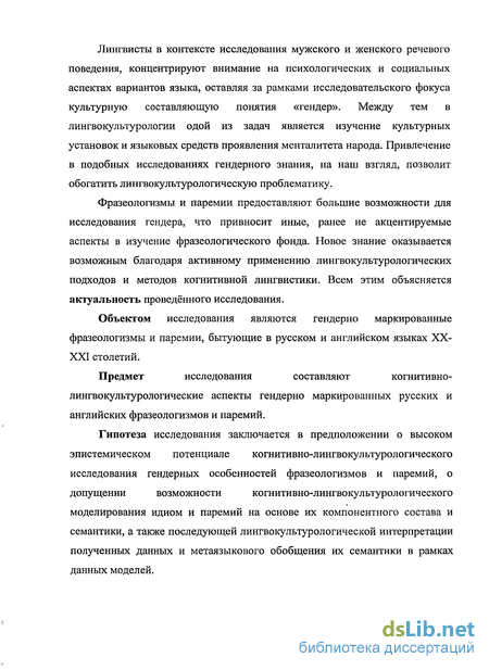 Предмет исследования составляют когнитивно- лингвокультурологические аспекты тендерно маркированных русских и английских фразеологизмов и паремий.