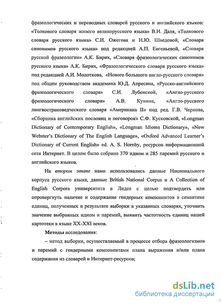 Материалом для нашего исследования послужила выборка идиом и паремий русского и английского языков, имеющих в своём составе значение и/или показатели тендера. На первом этапе сбора материала была произведена полная выборка изучаемых идиом и паремий из толковых, фразеологических и переводных словарей русского и английского языков: «Толкового словаря живого великорусского языка» В.И. Даля, «Толкового словаря русского языка» СИ. Ожегова и Н.Ю. Шведовой, «Словаря синонимов русского языка» под редакцией А.П. Евгеньевой, «Словаря русской фразеологии» А.К. Бирих, «Словаря фразеологических синонимов русского языка» А.К. Бирих, «Фразеологического словаря русского языка» под редакцией А.И. Молоткова, «Нового большого англо-русского словаря» под общим руководством академика Ю.Д. Апресяна, «Русско-английского фразеологического словаря» СИ. Лубенской, «Англо-русского фразеологического словаря» А.В. Кунина, «Англо-русского лингвострановедческого словаря «Американа II» под ред. Г.В. Чернова, «Сборника английских пословиц и поговорок» СФ. Кусковской, «Longman Dictionary of Contemporary English», «Longman Idioms Dictionary», «New Webster's Dictionary of The English Language», «Oxford Advanced Learner's Dictionary of Current English» ed. A. S. Hornby, ресурсов информационной сети Интернет. В целом было собрано 370'идиом и 285 паремий русского и английского языков.
