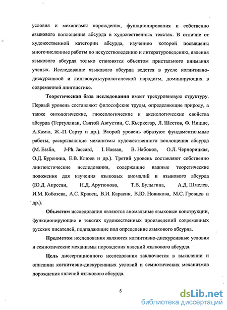 Теоретическая база исследования имеет трехуровневую структуру Первый уровень составляют философские труды, определяющие природу, а также онтологические, гносеологические и аксиологические свойства абсурда (Тертуллиан, Святой Августин, С. Кьеркегор, Л Шестов, Ф Ницше, А.Камю, Ж.-П Сартр и др.). Второй уровень образуют фундаментальные работы, раскрывающие механизмы художественного воплощения абсурда (М Esslin, J-Ph. Jaccard, I.Hassan, B.B Набоков, О Л Чернорицкая, ОД. Буренина, Е В. Клюев и др.). Третий уровень составляют собственно лингвистические исследования, содержащие важные теоретические положения для изучения языковых аномалий и языкового абсурда (Ю Д. Апресян, Н Д Арутюнова, Т В. Булыгина, А.Д Шмелев, И.М Кобозева, А.С. Кравец, В И Карасик, В Ю. Новикова, М С. Гревцев и др )