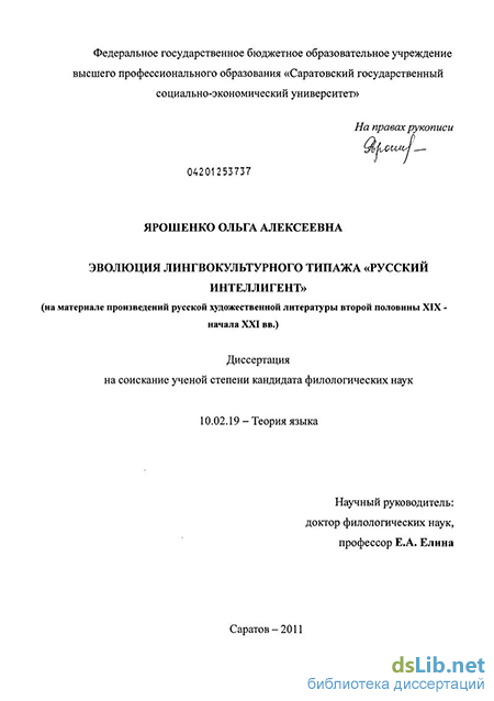 Данная работа выполнена в рамках лингвокультурологического направления в современном языкознании и посвящена изучению русской национальной концептосферы. Объектом исследования является лингвокультурный типаж «русский интеллигент», в качестве предмета изучения рассматривается эволюция понятийных, образных и ценностных характеристик данного типажа.