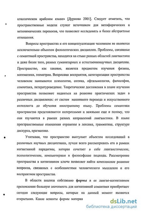 классическом арабском языке» [Дурново 2001]. Следует отметить, что пространственные модели служат источником для метафорических и метонимических переносов, что позволяет исследовать и более абстрактные отношения.
