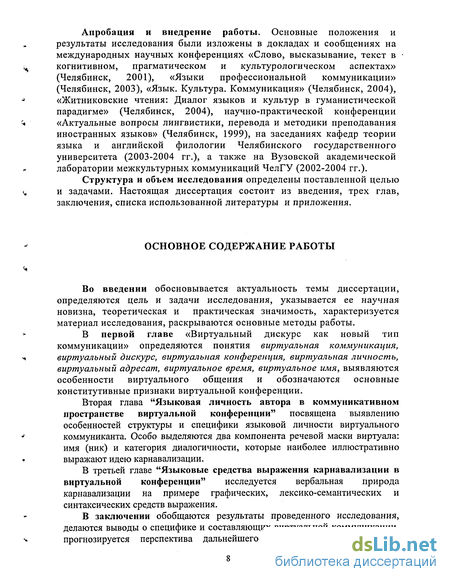 Апробация и внедрение работы. Основные положения и результаты исследования были изложены в докладах и сообщениях на международных научных конференциях «Слово, высказывание, текст в когнитивном, прагматическом и культурологическом аспектах» (Челябинск, 2001), «Языки профессиональной коммуникации» (Челябинск, 2003), «Язык. Культура. Коммуникация» (Челябинск, 2004), «Житниковские чтения: Диалог языков и культур в гуманистической парадигме» (Челябинск, 2004), научно-практической конференции «Актуальные вопросы лингвистики, перевода и методики преподавания иностранных языков» (Челябинск, 1999), на заседаниях кафедр теории языка и английской филологии Челябинского государственного университета (2003-2004 гг.), а также на Вузовской академической лаборатории межкультурных коммуникаций ЧелГУ (2002-2004 гг.).