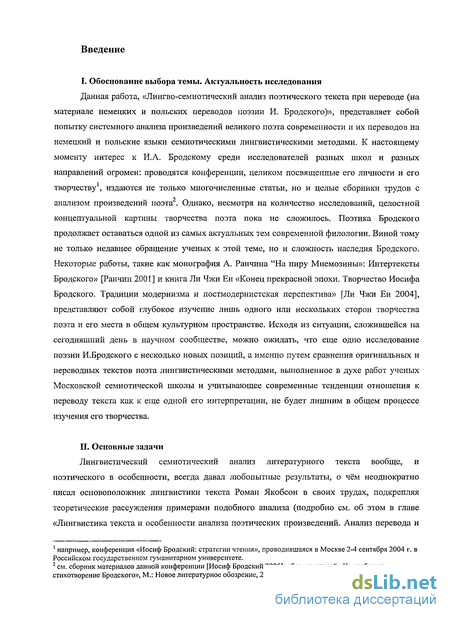 Данная работа, «Лингво-семиотический анализ поэтического текста при переводе (на материале немецких и польских переводов поэзии И. Бродского)», представляет собой попытку системного анализа произведений великого поэта современности и их переводов на немецкий и польские языки семиотическими лингвистическими методами. К настоящему моменту интерес к И.А. Бродскому среди исследователей разных школ и разных направлений огромен: проводятся конференции, целиком посвященные его личности и его творчеству , издаются не только многочисленные статьи, но и целые сборники трудов с анализом произведений поэта . Однако, несмотря на количество исследований, целостной концептуальной картины творчества поэта пока не сложилось. Поэтика Бродского продолжает оставаться одной из самых актуальных тем современной филологии. Виной тому не только недавнее обращение ученых к этой теме, но и сложность наследия Бродского. Некоторые работы, такие как монография А. Ранчина "На пиру Мнемозины»: Интертексты Бродского» [Ранчин 2001] и книга Ли Чжи Ен «Конец прекрасной эпохи. Творчество Иосифа Бродского. Традиции модернизма и постмодернистская перспектива» [Ли Чжи Ен 2004], представляют собой глубокое изучение лишь одного или нескольких сторон творчества поэта и его места в общем культурном пространстве. Исходя из ситуации, сложившейся на сегодняшний день в научном сообществе, можно ожидать, что еще одно исследование поэзии И.Бродского с несколько новых позиций, а именно путем сравнения оригинальных и переводных текстов поэта лингвистическими методами, выполненное в духе работ ученых Московской семиотической школы и учитывающее современные тенденции отношения к переводу текста как к еще одной его интерпретации, не будет лишним в общем процессе изучения его творчества.