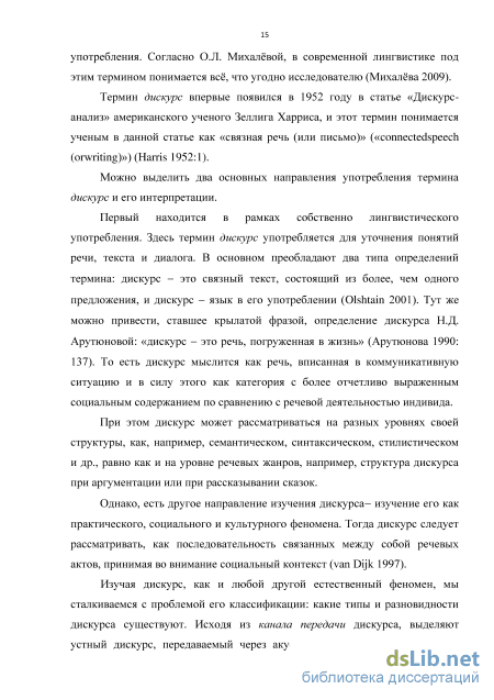 Первый находится в рамках собственно лингвистического употребления. Здесь термин дискурс употребляется для уточнения понятий речи, текста и диалога. В основном преобладают два типа определений термина: дискурс - это связный текст, состоящий из более, чем одного предложения, и дискурс - язык в его употреблении (Olshtain 2001). Тут же можно привести, ставшее крылатой фразой, определение дискурса Н.Д. Арутюновой: «дискурс - это речь, погруженная в жизнь» (Арутюнова 1990: 137). То есть дискурс мыслится как речь, вписанная в коммуникативную ситуацию и в силу этого как категория с более отчетливо выраженным социальным содержанием по сравнению с речевой деятельностью индивида.