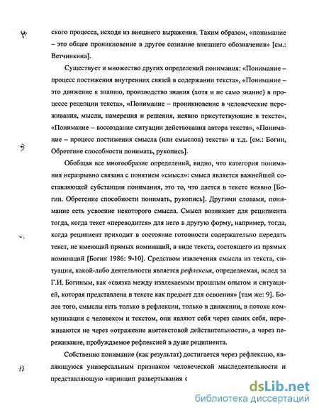 Обобщая все многообразие определений, видно, что категория понимания неразрывно связана с понятием «смысл»: смысл является важнейшей составляющей субстанции понимания, это то, что дается в тексте неявно [Богин. Обретение способности понимать, рукопись]. Другими словами, понимание есть усвоение некоторого смысла. Смысл возникает для реципиента тогда, когда текст «переводится» для него в другую форму, например, тогда, когда реципиент приходит в состояние готовности содержательно передать текст, не имеющий прямых номинаций, в виде текста, состоящего из прямых номинаций [Богин 1986: 9-10]. Средством извлечения смысла из текста, ситуации, какой-либо деятельности является рефлексия, определяемая, вслед за Г.И. Богиным, как «связка между извлекаемым прошлым опытом и ситуацией, которая представлена в тексте как предмет для освоения» [там же: 9]. Более того, смыслы есть только в рефлексии, только в движении, в потоке коммуникации с человеком и текстом, они являют себя через самих себя, переживаются не через «отражение внетекстовой действительности», а через переживание, пробуждаемое рефлексией в душе реципиента.