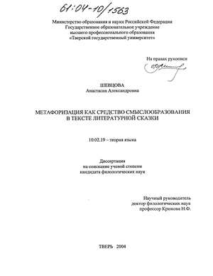 Предмет исследования составляют способы репрезентации смысловых отношений в текстах литературных сказок, выражающиеся в особенностях сюжетопостроения, композиции и языка сказок и выявляемые с помощью обращения к приемам и средствам текстопостроения, основным из которых является метафоризация.