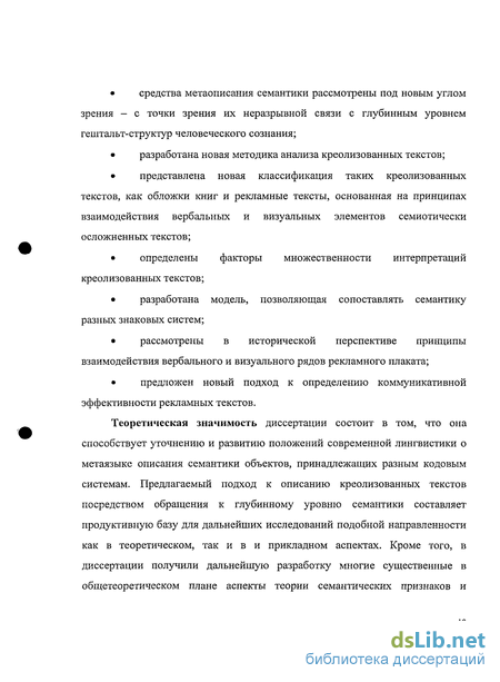 Теоретическая значимость диссертации состоит в том, что она способствует уточнению и развитию положений современной лингвистики о метаязыке описания семантики объектов, принадлежащих разным кодовым системам. Предлагаемый подход к описанию креолизованных текстов посредством обращения к глубинному уровню семантики составляет продуктивную базу для дальнейших исследований подобной направленности как в теоретическом, так и в и прикладном аспектах. Кроме того, в диссертации получили дальнейшую разработку многие существенные в общетеоретическом плане аспекты теории семантических признаков и