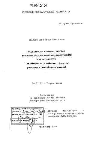 Теоретическая и практическая значимость диссертационного труда заключается в многоплановости и многомерности изучения феномена фразеологической концептуализации морально-нравственной сферы личности в русском и адыгейском языках, что позволило обосновать