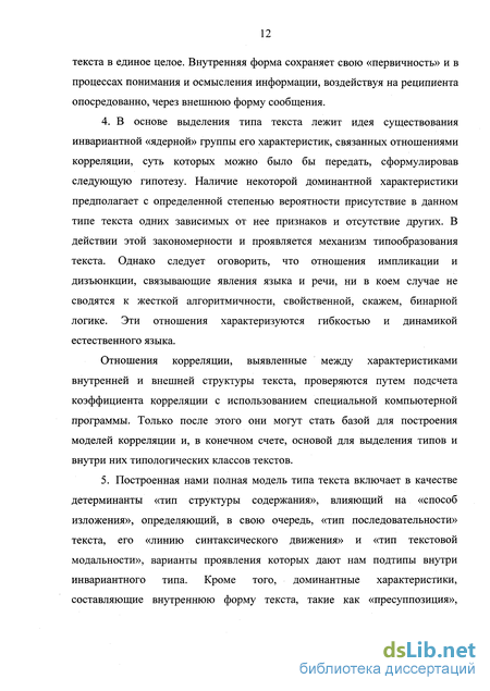 4. В основе выделения типа текста лежит идея существования инвариантной «ядерной» группы его характеристик, связанных отношениями корреляции, суть которых можно было бы передать, сформулировав следующую гипотезу. Наличие некоторой доминантной характеристики предполагает с определенной степенью вероятности присутствие в данном типе текста одних зависимых от нее признаков и отсутствие других. В действии этой закономерности и проявляется механизм типообразования текста. Однако следует оговорить, что отношения импликации и дизъюнкции, связывающие явления языка и речи, ни в коем случае не сводятся к жесткой алгоритмичности, свойственной, скажем, бинарной логике. Эти отношения характеризуются гибкостью и динамикой естественного языка.