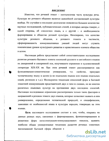 Настоящая работа представляет собой сопоставительное исследование развития речевого бытового этикета носителей русского и английского языков на диахронной и синхронной оси, получившего отражение в художественной литературе ХІХ-ХХ вв. При этом речевой этикет рассматривается как функционально-семантическая универсалия, т.е. свойство, присущее человеческому языку в целом (а не отдельным языкам или языкам отдельных семей, регионов и т.д.). Исследуются тенденции изменений форм в бытовой этикетной коммуникации представителей двух в чем-то схожих, но во многом различных языковых культур на протяжении двух последних столетий. Настоящее исследование ограничено рассмотрением только таких факторов и направлений в речевом этикете двух языков, которые позволяют выявить в нем универсальное, определяемое человеческой природой, и специфическое, зависящее от особенностей языка и культуры народов, говорящих на этих языках.