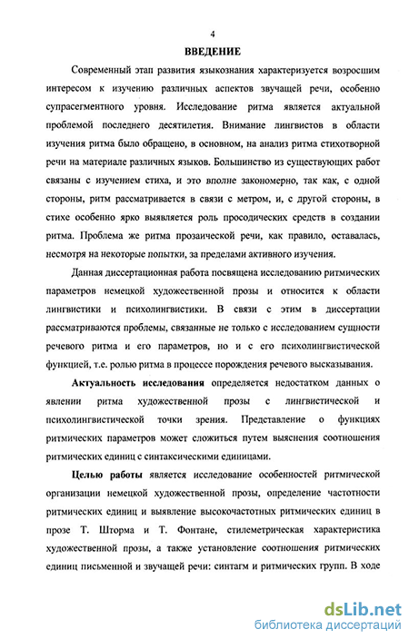 Данная диссертационная работа посвящена исследованию ритмических параметров немецкой художественной прозы и относится к области лингвистики и психолингвистики. В связи с этим в диссертации рассматриваются проблемы, связанные не только с исследованием сущности речевого ритма и его параметров, но и с его психолингвистической функцией, т.е. ролью ритма в процессе порождения речевого высказывания.