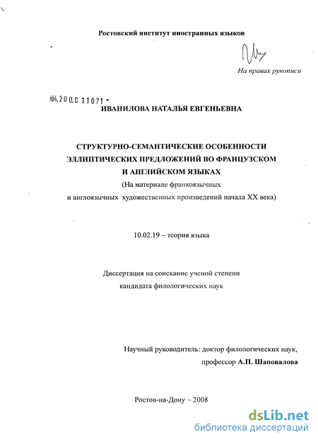 Особенности эллиптических предложений в лингвистике (на материале французского, английского и русского языков) // Научная мысль Кавказа. - Ростов-на-Дону : СКНЦ ВШ, 2006. - С.227-231.