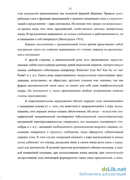 В.В. Виноградов определял предложение как грамматически оформленную по законам данного языка целостную единицу речи, являющуюся главным средством формирования, выражения и сообщения мысли [Виноградов 1955: 254]. Язык как орудие общения и обмена мыслями между всеми членами обще ства пользуется предложением как основной формой общения. Правила употребления слов в функции предложений и правила соединения слов и словосочетаний в предложении — ядро синтаксиса. На основе этих правил устанавливаю і -ся разные виды или типы предложений, свойственные данному конкретному языку. В предложении выражается не только сообщение о действительности, но и отношение к ней говорящего [Виноградов 1955].