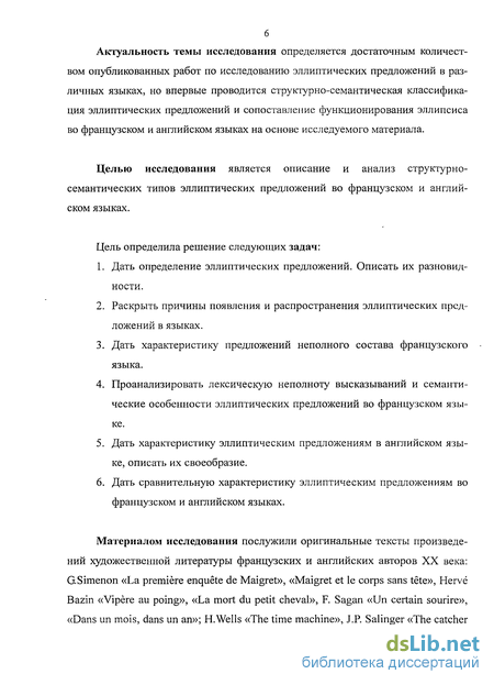 Актуальность темы исследования определяется достаточным количеством опубликованных работ по исследованию эллиптических предложений в различных языках, но впервые проводится структурно-семантическая классификация эллиптических предложений и сопоставление функционирования эллипсиса во французском и английском языках на основе исследуемого материала.