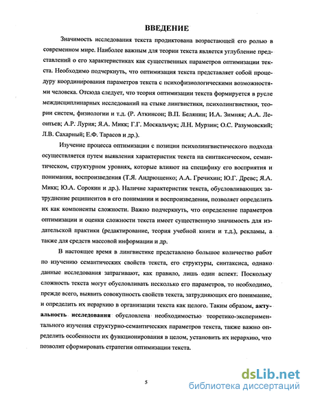 Значимость исследования текста продиктована возрастающей его ролью в современном мире. Наиболее важным для теории текста является углубление представлений о его характеристиках как существенных параметров оптимизации текста. Необходимо подчеркнуть, что оптимизация текста представляет собой процедуру координирования параметров текста с психофизиологическими возможностями человека. Отсюда следует, что теория оптимизации текста формируется в русле междисциплинарных исследований на стыке лингвистики, психолингвистики, теории систем, физиологии и т.д. (Р. Аткинсон; В.П. Белянин; И.А. Зимняя; А.А. Леонтьев; А.Р. Лурия; Я.А. Микк; Г.Г. Москальчук; Л.Н. Мурзин; О.С. Разумовский; Л.В. Сахарный; Е.Ф. Тарасов и др.).