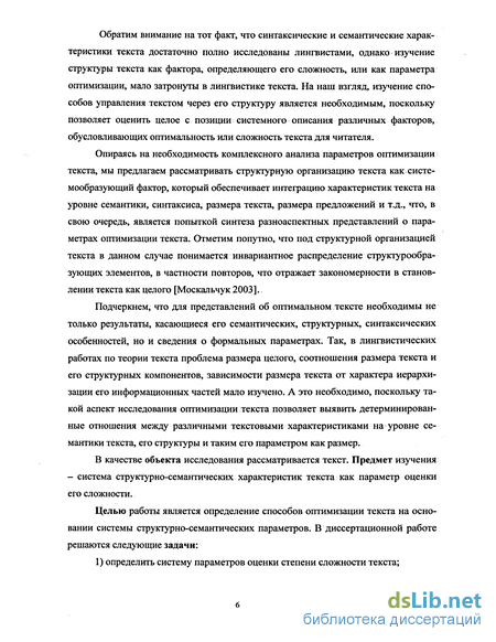 Целью работы является определение способов оптимизации текста на основании системы структурно-семантических параметров. В диссертационной работе решаются следующие задачи: