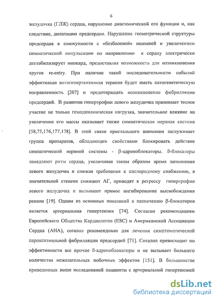 желудочка (ГЛЖ) сердца, нарушение диастолической его функции и, как следствие, дилатацию предсердия. Нарушение геометрической структуры предсердия в совокупности с «безболевой» ишемией и увеличением симпатической импульсации по направлению к сердцу электрически дестабилизирует миокард, предоставляя возможность для возникновения кругов re-entry. При наличии такой последовательности событий эффективная антигипертензивная терапия будет иметь патогенетическую направленность [207] и предотвращать возникновение фибрилляции предсердий. В развитии гипертрофии левого желудочка принимает тесное участие не только гемодинамическая нагрузка, значительное влияние на увеличение его массы оказывает также симпатическая нервная система [58,75,176,177,178]. В этой связи пристального внимания заслуживает группа препаратов, обладающих свойствами блокировать действие симпатической нервной системы - (3-адреноблокаторы. В-блокаюры замедляют ритм сердца, увеличивая таким образом время заполнения левого желудочка и снижая требования к кислородному снабжению, в значительной степени снижают АГ, приводят к регрессу гипертрофии левого желудочка и вызывают прямое ингибирование высвобождения ренина [19]. Одним из основных показаний к назначению Р-блокаторов является артериальная гипертензия [74]. Согласно рекомендациям Европейского Общества Кардиологов (ESC) и Американской Ассоциации Сердца (AHA), соталол рекомендован для лечения симптоматической пароксизмальной фибрилляции предсердий [71]. Соталол превосходит по эффективности все прочие В-адреноблокаторы и не вызывает большего количества нежелательных побочных эффектов [151]. В большинстве приведенных выше исследований пациенты с артериальной гипертензией