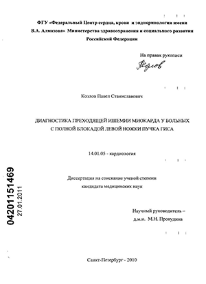 Козлов, Павел Станиславович. Диагностика преходящей ишемии миокарда у больных с полной блокадой левой ножки пучка Гиса : диссертация ... кандидата медицинских наук : 14.01.05 / Козлов Павел Станиславович; [Место защиты: Федеральное государственное учреждение Федеральный центр сердца, крови и эндокринологии].- Санкт-Петербург, 2010.- 123 с.: ил.