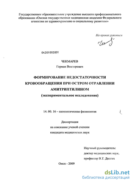 Научная новизна. Экспериментально установлено, что психотропный препарат амитриптилин в токсических дозах вызывает развитие недостаточности кровообращения, проявляющейся снижением минутного и ударного объема сердца, артериальной гипотензией, уменьшением общего периферического сопротивления сосудов.