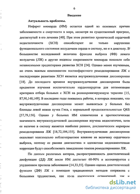 Инфаркт миокарда (ИМ) остается одной из основных причин заболеваемости и смертности в мире, несмотря на существенный прогресс, достигнутый в его лечении [40]. При этом развитию хронической сердечной недостаточности (ХСН) способствуют не только нарушения функционального состояния желудочков сердца в систолу, но и в диастолу. В' большинстве исследований величина фракции выброса (ФВ) левого желудочка (ЛЖ) и другие индексы сократимости миокарда показали себя независимыми предикторами развития ХСН [24]. Однако менее изученным, но очень важным компонентом постинфарктного ремоделирования ЛЖ с последующим развитием ХСН является внутрижелудочковая диссинхрония [18]. До последнего времени внутрижелудочковая диссинхрония была предметом изучения исключительно кардиохирургов для оптимизации критериев отбора больных с ХСН на ресинхронизирующую терапию [15, 87,90,148,149]. В последние годы появились работы, в которых показано, что внутрижелудочковая диссинхрония может выявляться у больных без блокады левой ножки пучка Гиса, с нормальной продолжительностью QRS [57,79,150]. Однако у больных ИМ клиническая и прогностическая значимость внутрижелудочковои диссинхронии изучена недостаточно, хотя* ее наличие в систолу является наиболее ранним, доклиническим маркером ремоделирования ЛЖ [18,72,104,155]. Внутрижелудочковая диссинхрония оказывает максимально неблагоприятное влияние на величину сердечного выброса, поэтому ее ранняя диагностика и адекватная медикаментозная коррекция будут способствовать замедлению темпов ремоделирования ЛЖ.
