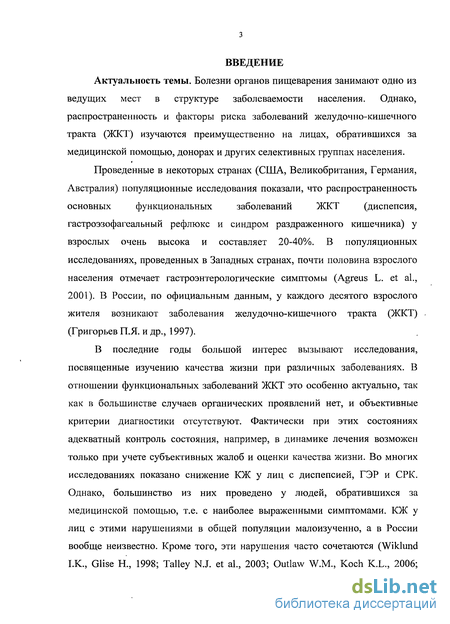 В последние годы большой интерес вызывают исследования, посвященные изучению качества жизни при различных заболеваниях. В отношении функциональных заболеваний ЖКТ это особенно актуально, так как в большинстве случаев органических проявлений нет, и объективные критерии диагностики отсутствуют. Фактически при этих состояниях адекватный контроль состояния, например, в динамике лечения возможен только при учете субъективных жалоб и оценки качества жизни. Во многих исследованиях показано снижение КЖ у лиц с диспепсией, ГЭР и СРК. Однако, большинство из них проведено у людей, обратившихся за медицинской помощью, т.е. с наиболее выраженными симптомами. КЖ у лиц с этими нарушениями в общей популяции малоизученно, а в России вообще неизвестно. Кроме того, эти нарушения часто сочетаются (Wiklund I.K., Glise Н., 1998; Talley N.J. et al., 2003; Outlaw W.M., Koch K.L., 2006;