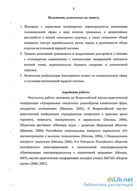 В литературе встречаются данные о том, что наличие депрессии, повышенный уровень тревожности, болевой синдром оказывают существенное влияние на состояние вегетативной нервной системы [44, 53, 121]. Справедливо предположить, что изменения вегетативной регуляции происходят и при остеопорозе, однако в литературе эти данные не встречаются.
