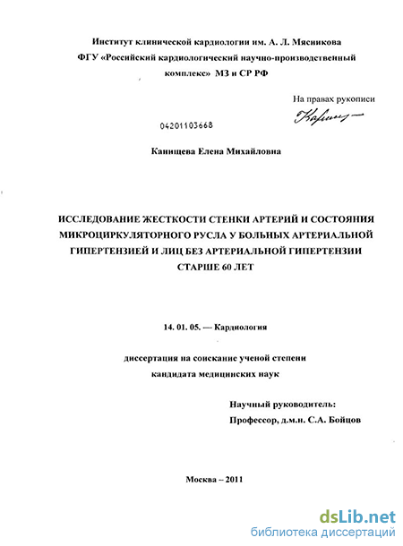 Канищева, Елена Михайловна. Исследование жесткости стенки артерий и состояния микроциркулярного русла у больных артериальной гипертензией и лиц без артериальной гипертензии старше 60 лет : диссертация ... кандидата медицинских наук : 14.01.05 / Канищева Елена Михайловна; [Место защиты: ФГУ "Российский кардиологический научно-производственный комплекс"].- Москва, 2011.- 127 с.: ил.