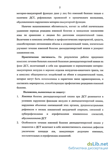 Практическая значимость. По результатам работы предложен комплекс лечения больных язвенной болезнью двенадцатиперстной кишки на фоне ДСТ, включающий в себя как эрадикацию и нормализацию моторно-эвакуаторных механизмов верхних отделов желудочно-кишечного тракта, так и комплекс общепринятых воздействий на обмен в соединительной ткани, которые могут быть использованы в первичном