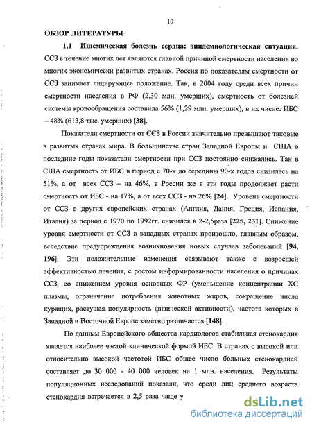 Показатели смертности от ССЗ в России значительно превышают таковые в развитых странах мира. В большинстве стран Западной Европы и США в последние годы показатели смертности при ССЗ постоянно снижались. Так в США смертность от ИБС в период с 70-х до середины 90-х годов снизилась на 51%, а от всех ССЗ - на 46%, в России же в эти годы продолжает расти смертность от ИБС - на 17%, а от всех ССЗ - на 26% [24]. Уровень смертности от ССЗ в других европейских странах (Англия, Дания, Греция, Испания, Италия) за период с 1970 по 1992гг. снизился в 2-2,5раза [225, 231]. Снижение уровня смертности от ССЗ в западных странах произошло, главным образом, вследствие предупреждения возникновения новых случаев заболеваний [94, 196]. Эти положительные изменения связывают также с возросшей эффективностью лечения, с ростом информированности населения о причинах ССЗ, со снижением уровня основных ФР (уменьшение концентрации ХС плазмы, ограничение потребления животных жиров, сокращение числа курящих, растущая, популярность физической активности), частота которых в Западной и Восточной Европе заметно различается [148].