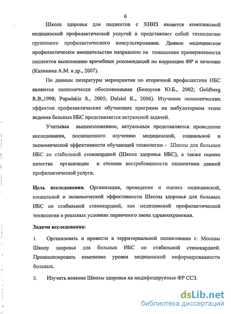 Учитывая вышеизложенное, актуальным представляется- проведение исследования, посвященного изучению медицинской, социальной и экономической эффективности обучающей технологии - Школы для больных ИБС со стабильной стенокардией (Школа здоровья ИБС), а также оценке качества организации и степени востребованности пациентами данной профилактической услуги.