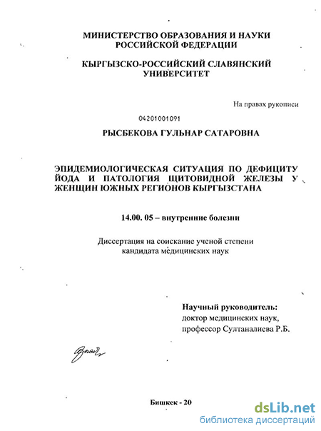 Апробация работы. Апробация диссертационной работы состоялась 2 июня 2009 года на межкафедральной конференции кафедр терапевтических дисциплин №1, Кыргызско-Российского Славянского университета и госпитальной терапии Кыргызской государственной медицинской академии им. И.К. Ахунбаева.