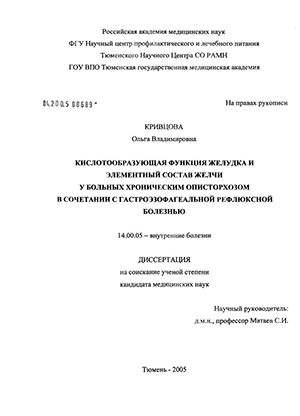 Апробация результатов исследования: Материалы исследований представлены и обсуждены на Региональной V научно-практической конференции "Пожилой человек. Качество жизни" (Тюмень, 2000); Международном симпозиуме "Медицина и охрана здоровья 2002" (Тюмень, 2002); Научно-практической конференции "Вопросы внутренних болезней в Тюменском регионе" (Тюмень, 2003 год); VII Международной научной конференции "Здоровье семьи - XXI век" (Пермь (Россия), Валетта (Мальта), 2003); X Российской гастроэнтерологической неделе (Москва, 2004); заседаниях Тюменского общества гастроэнтерологов (Тюмень, 2003, 2004); межлабораторной конференции ГУ НИИ питания РАМН (Москва, 2004), V Международной конференции по реабилитологии (Москва, 2004).