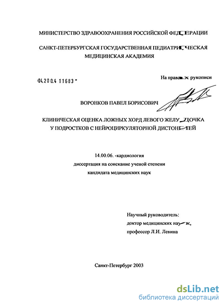 Воронков Павел Борисович. Клиническая оценка ложных хорд левого желудочка у подростков с нейроциркуляторной дистонией : диссертация ... кандидата медицинских наук : 14.00.06 / Воронков Павел Борисович; [Место защиты: Государственное образовательное учреждение дополнительного профессионального образования "Санкт-Петербургская медицинская академия последипломного образования"].- Санкт-Петербург, 2004.- 133 с.: ил.