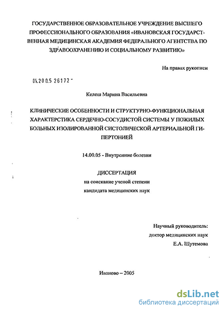 Келеш Марина Васильевна. Клинические особенности и структурно-функциональная характеристика сердечно-сосудистой системы у пожилых больных изолированной систолической артериальной гипертонией : диссертация ... кандидата медицинских наук : 14.00.05 / Келеш Марина Васильевна; [Место защиты: Центральный научно-исследовательский институт гастроэнтерологии].- Москва, 2005.- 107 с.: ил.