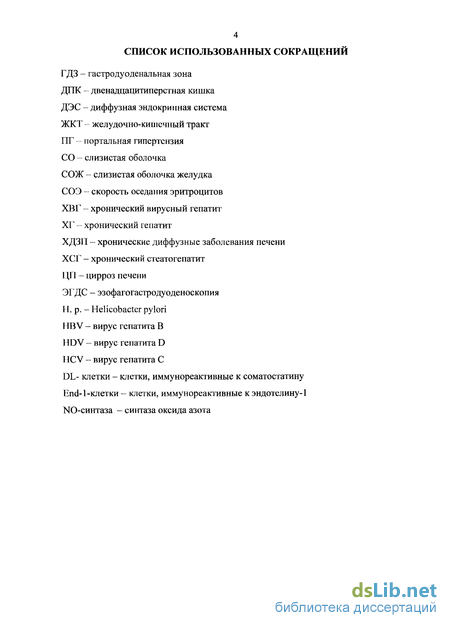 В настоящее время среди заболеваний ЖКТ одну из наиболее актуальных проблем представляют ХДЗП. ГДЗ закономерно вовлекается в патологический процесс. Это определяется анатомо-физиологической взаимосвязью ГДЗ с печенью, их функциональным взаимодействием и общностью нейрогуморальной регуляции [12, 53, 57, 62, 65, 104, 148, 211, 239]. При этом многие аспекты формирования и прогрессирования патологии СО ГДЗ при ХДЗП остаются недостаточно изученными. В частности, остаются предметом дискусии частота встречаемости различных вариантов патологии СО ГДЗ, их клинические, эндоскопические, морфологические, гистобактериоскопические особенности. Не определена связь разных вариантов патологии ГДЗ с этиологией, активностью и стадией патологического процесса в печени. Не исследована роль биогенных аминов и пептидных гормонов, вырабатываемых клетками ДЭС, иммунореактивными к соматостатину, эндотелину-1 и NO-синтазе, в развитии патологии ГДЗ при ХДЗП. Не изучена пролиферативная способность и показатели апоптоза эпителиоцитов СОЖ в развитии патологии ГДЗ на фоне ХДЗП. Осутствуют исследования о взаимосвязях и взаимовлияниях нейроэндокринного дисбаланса и пролиферативной активности эпителиоцитов СОЖ. Целью настоящей работы стала оценка частоты встречаемости, механизмов развития, клинических проявлений, разработка новых диагностических и прогностических критериев патологии ГДЗ при ХГ и ЦП в зависимости от этиологии, активности и стадии патологического процесса в печени. Для решения поставленных задач проведено комплексное клинико-лабораторное и инструментальное обследование 76 пациентов с ХГ и 74 пациентов с ЦП. Контрольную группу составили 25 практически здоровых лиц. Диагноз ХДЗП выставлялся на основании жалоб больных, изучения анамнеза, физикального обследования, лабораторных и инструментальных методов исследования, консультаций невролога, хирурга, инфекциониста. При постановке диагноза использованы общепринятые в настоящий момент классификации [87, 122, 133, 141, 148]. Морфологическая верификация ХДЗП проведена 2% пациентов. Наряду со стандартным комплексом клинико-лабораторного и инструментального обследования пациентов с ХДЗП, обследование включало морфологическое исследование биоптатов антрального отдела желудка с определением Н.р. обсемененности, прицельным анализом эпителиоцитов, иммунореактивных к соматостатину, эндотелину-1 и NO-синтазе, изучением пролиферативной активности клеток СОЖ, морфометрию. Результаты обработаны статистически.