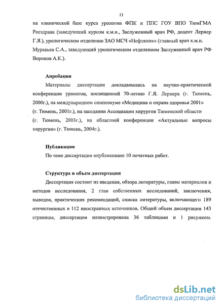 Материалы диссертации докладывались на научно-практической конференции урологов, посвященной 70-летию Г.Я. Лернера (г. Тюмень, 2000г.), на международном симпозиуме «Медицина и охрана здоровья 2001» (г. Тюмень, 2001г.), на заседании Ассоциации хирургов Тюменской области (г. Тюмень, 2003 г.), на областной конференции «Актуальные вопросы хирургии» (г. Тюмень, 2004г.).