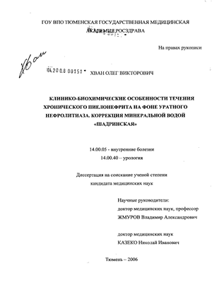 8 которой большое значение Л.Е Вейс (2000), В.В. Попова (2002) придают питьевому лечению минеральными водами. Новое геополитическое положение России и изменившиеся экономические условия сделали малодоступными многие курорты Ближнего и Дальнего зарубежья для жителей Сибири, что определяет необходимость изучения местных минеральных источников. Нам представляется наиболее патогенетически обоснованным использование среднеминерализованной слабоуглекислой лечебно-столовой хлоридно-гидрокарбонатно-натриевой воды «Шадринская» при хроническом пиелонефрита на фоне уратного нефролитиаза. Немногочисленные исследования течения хронического пиелонефрита на фоне уратного нефролитиаза, а также противоречивость и неоднозначность имеющихся сведений о влиянии бальнеотерапии, свидетельствуют о важности и перспективности изучения указанных аспектов.